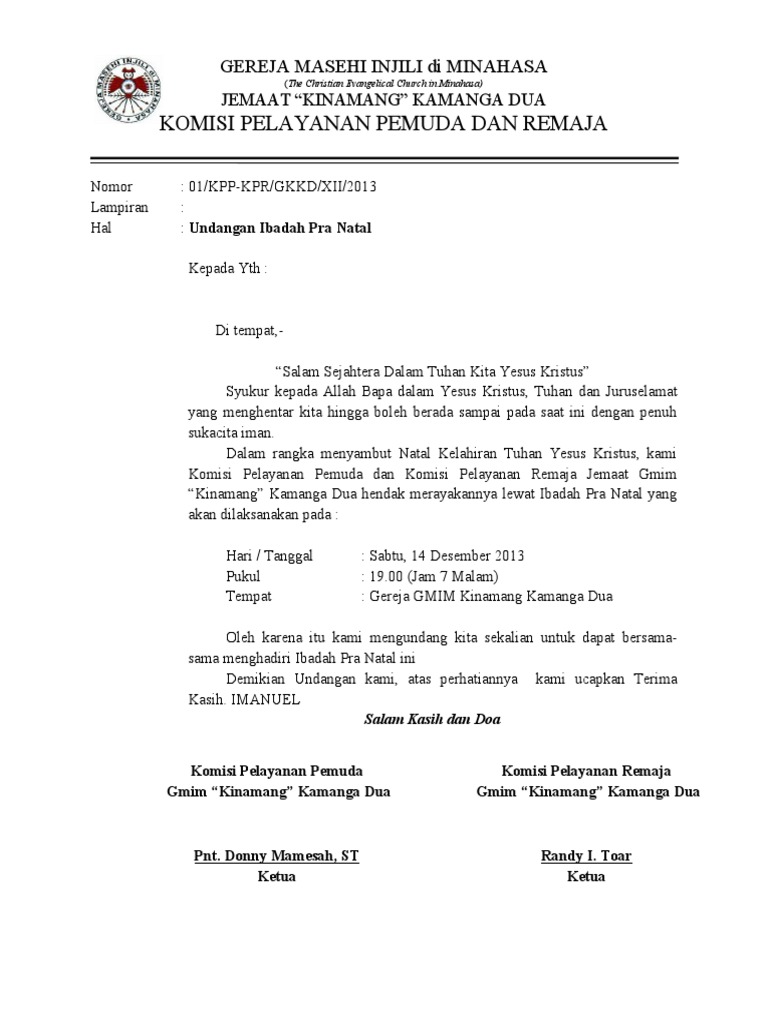 Format Undangan Natal 5143g3ox7onj from idoc.pub Contoh surat undangan resmi yang sejenis. Contoh surat undangan natal untuk gereja modif koh. Artikel ini membahas contoh surat undangan remi, setengah resmi dan tidak resmi, gunak keperluan sekolah, perusahaan dan kegiatan lainya.✅. Surat undangan resmi untuk rapat, pertemuan atau sosialisasi resmi yang bisa anda gunakan sebagai contoh referensi untuk keperluan surat anda. Pembuatan surat undangan sangatlah diperlukan apabila sebuah lembaga maupun organisasi ingin mengundang beberapa orang penting untuk bisa. Contoh surat undangan rapat sekolah. Contoh surat pemberitahuan ke polisi. Ketika ingin menyelenggarakan acara perayaan natal, maka tentu dibutuhkan persiapan yang matang.